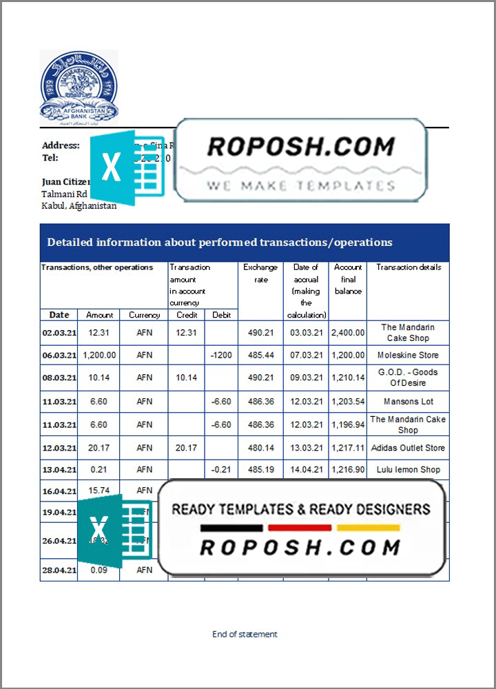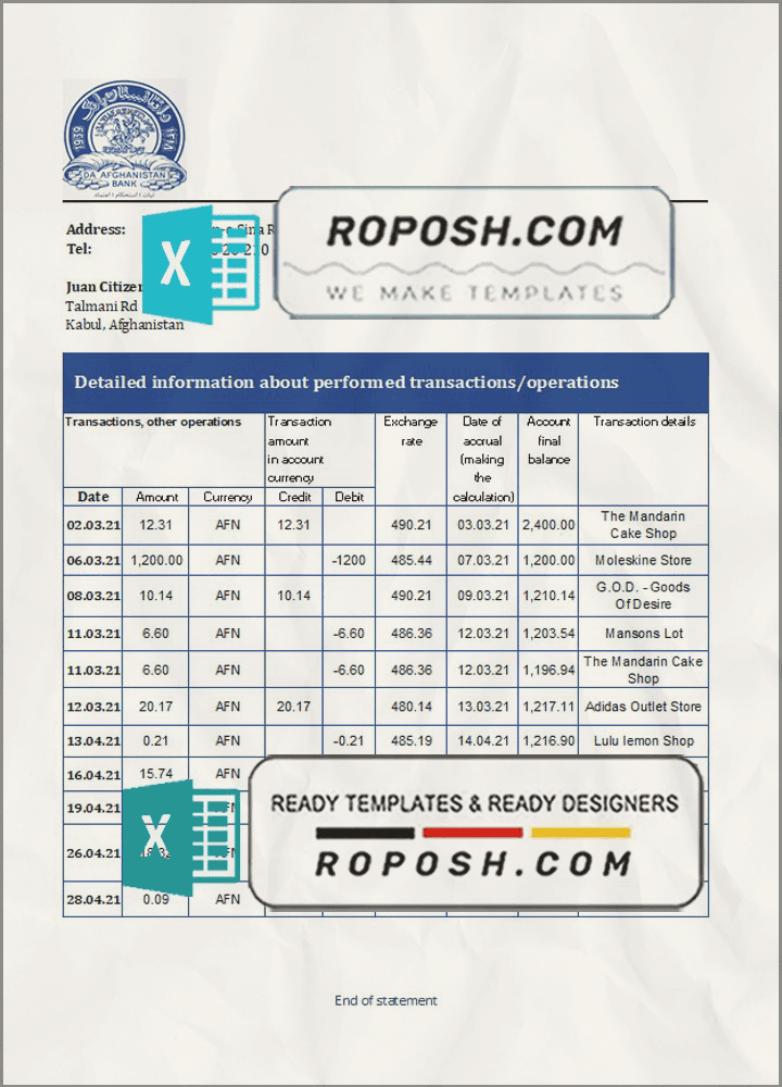 Get your fully editable Afghanistan Da Afghanistan Bank Statement Excel Template from our website Roposh. Customize it with your own information to create a realistic bank statement. This is especially useful if your bank statement is expired, stolen, or unavailable. We also offer editable credit card templates, ID card PSD templates, bank statement PSD templates, driver’s license PSD templates, and printable editable blank utility bill templates.