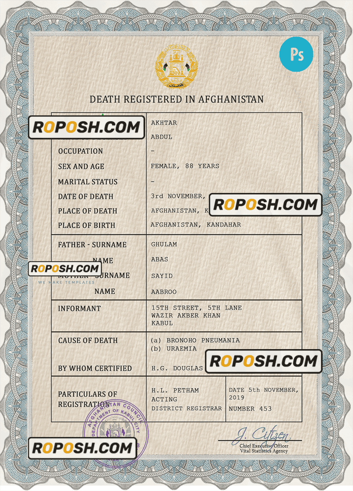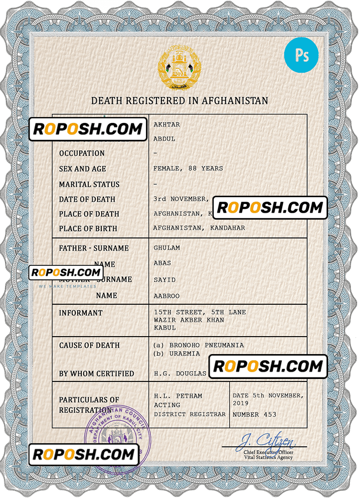 Be the first to review “Afghanistan vital record death certificate PSD template”