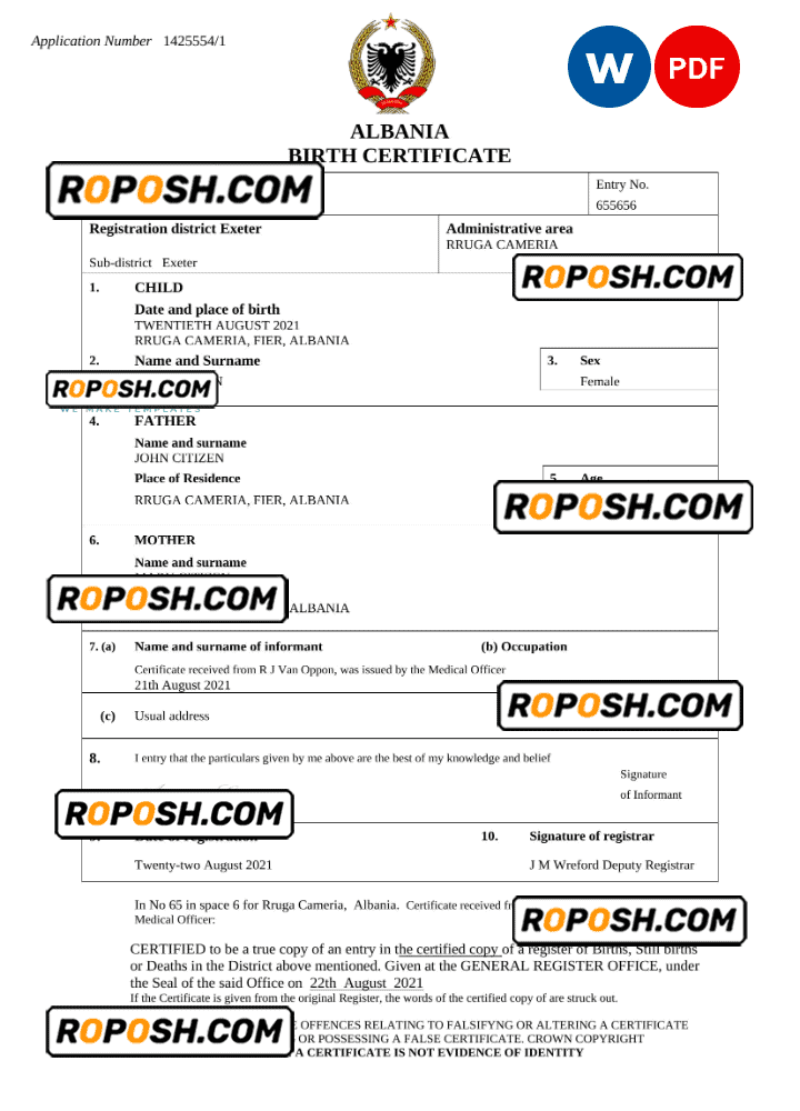roposh offers hundreds of high-quality, realistic, and customizable birth certificates. The Albania birth certificate template is fully fillable, and you can complete it with any information you wish, such as name, surname, birth date, place of birth and etc. Whether you are using our PSD template (a layer-based adobe photoshop file) or our PDF template (a Microsoft Office editable file) you will get a package with fonts included instantly. No need to worry even if you can’t generate realistic birth proof yourself, we offer reliable editing service with your desired information for an extra charge. Also, we are always online and here to help you experience a confident purchase. So, reach out!
