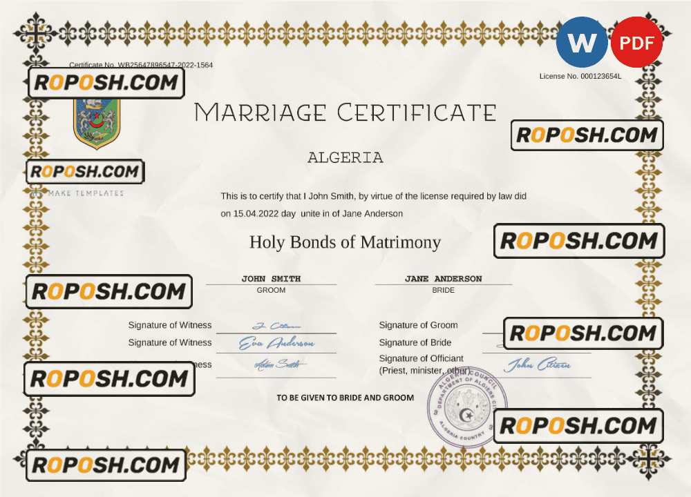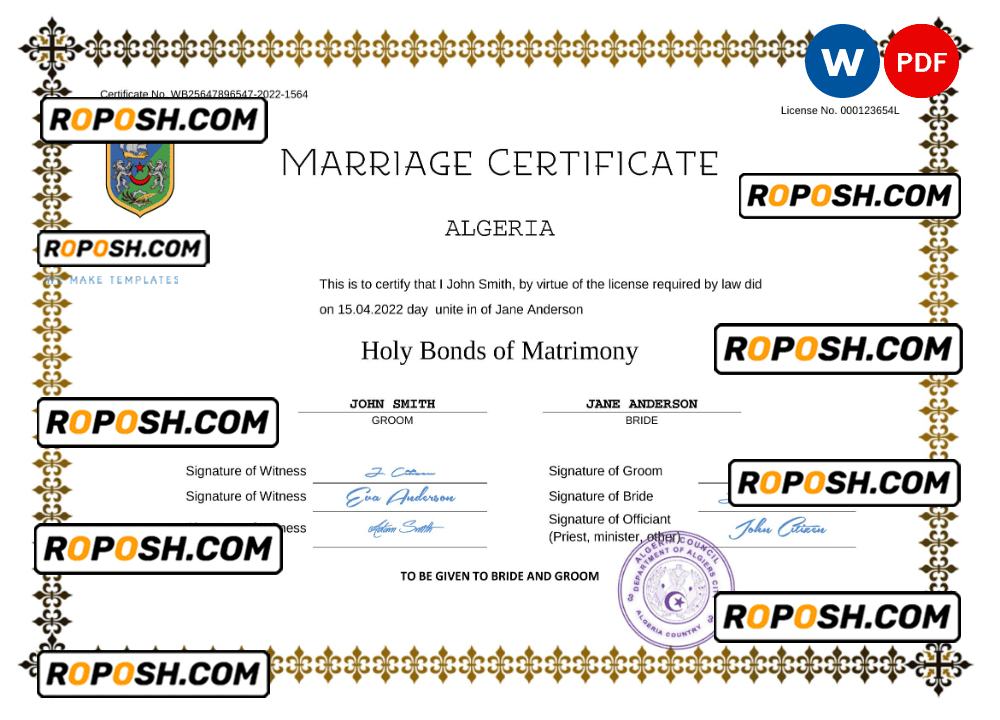 Get your printable Algeria marriage certificate templates now and join our growing list of satisfied customers!
