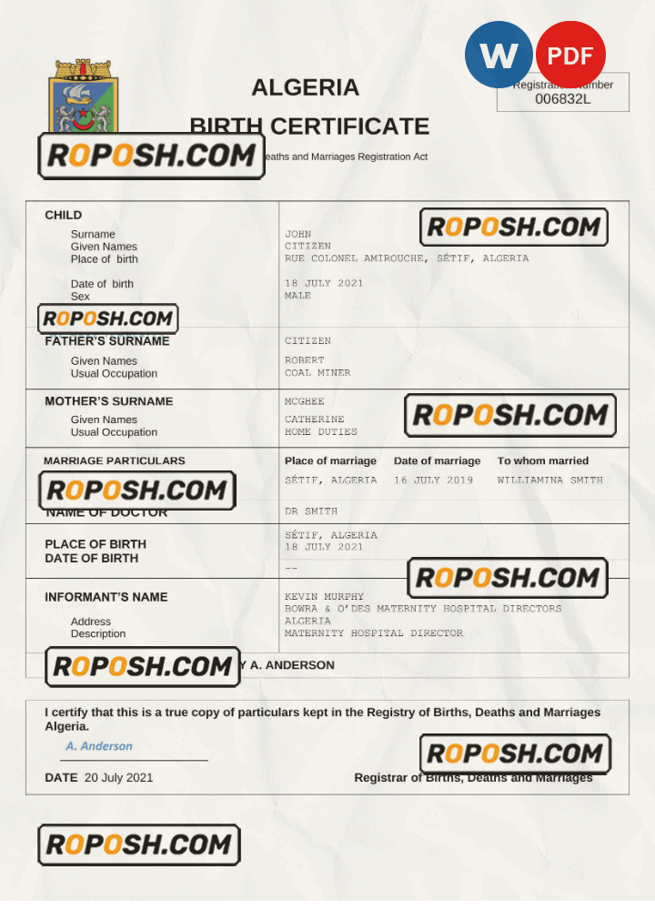 roposh offers hundreds of high-quality, realistic, and customizable birth certificates. The Algeria birth certificate template is fully fillable, and you can complete it with any information you wish, such as name, surname, birth date, place of birth and etc. Whether you are using our PSD template (a layer-based adobe photoshop file) or our PDF template (a Microsoft Office editable file) you will get a package with fonts included instantly. No need to worry even if you can’t generate realistic birth proof yourself, we offer reliable editing service with your desired information for an extra charge. Also, we are always online and here to help you experience a confident purchase. So, reach out!