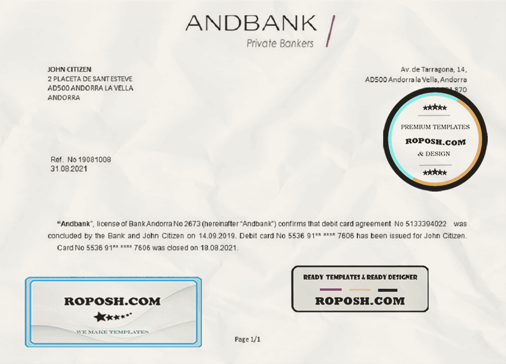 Andorra Andbank account closure reference letter template in Word and PDF format
