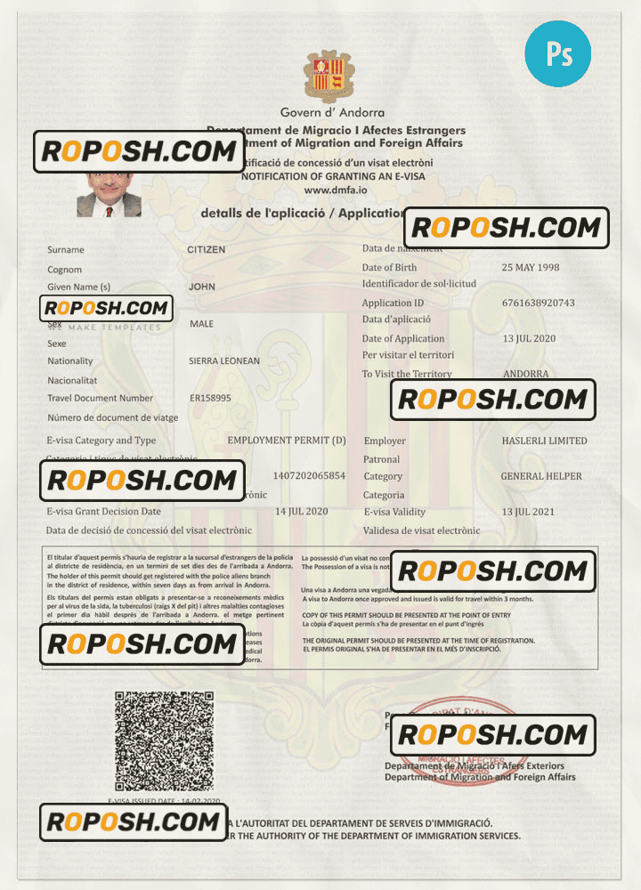 ANDORRA E-visa template psd. Buy Customizable Travel Visa Template with high quality and enjoy its unique features such as easy to customize, Layer based, fonts included sample. you can edit this template and put any name, address, license number, Id number, birth date, height, weight, expire date, change photos etc. This Photoshop template is a layer based psd file and it’s easy to Editing.To modify this photoshop template file you will need a Photo editing software such as Adobe Photoshop No need to be expert on editing software like adobe Photoshop. However, You just have to basic knowledge on adobe photoshop, to edit this template. Never used low quality template. Your account may be suspended. Also, if you’re looking for an editable SSN template, Roposh is by your side so you can get it easily and even for free.
