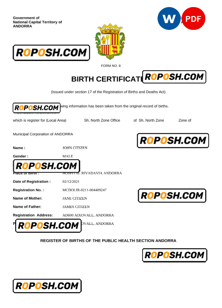roposh offers hundreds of high-quality, realistic, and customizable birth certificates. The Andorra birth certificate template is fully fillable, and you can complete it with any information you wish, such as name, surname, birth date, place of birth and etc. Whether you are using our PSD template (a layer-based adobe photoshop file) or our PDF template (a Microsoft Office editable file) you will get a package with fonts included instantly. No need to worry even if you can’t generate realistic birth proof yourself, we offer reliable editing service with your desired information for an extra charge. Also, we are always online and here to help you experience a confident purchase. So, reach out!