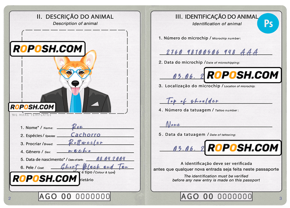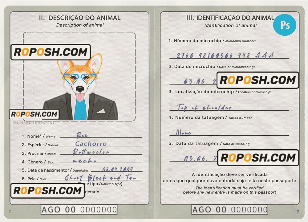 Angola dog (animal, pet) passport PSD template, is designed to look and feel like real documents. Each template is carefully crafted to include all the necessary details, such as your pet’s name, breed, date of birth, and microchip information. With our fillable cat or dog passport templates, you can quickly and easily create a editable pet passport that meets all the requirements for international travel.