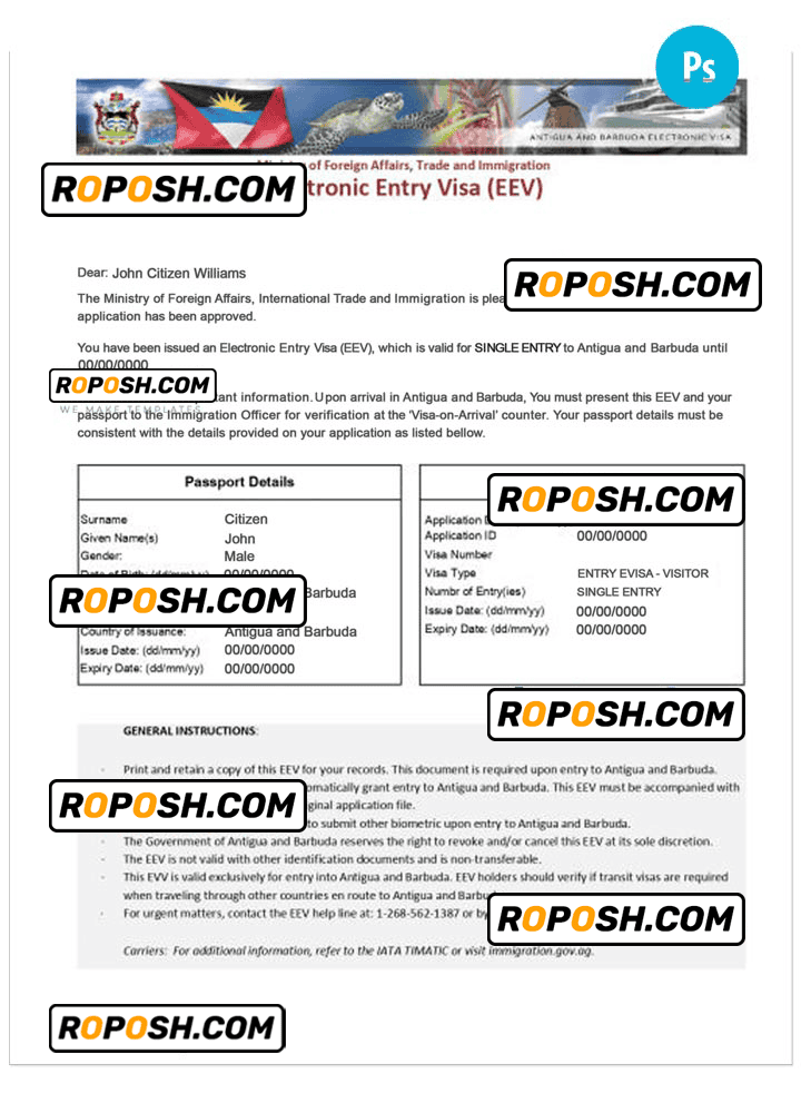 Grab now fully editable ANTIGUA AND BARBUDA Electronic Entry Visa Psd Template from our website roposh and put your own info to create a copy of ANTIGUA AND BARBUDA Electronic Entry Visa psd template and ready your own novelty documents. It’ll be so beneficial if your ID Card is expired, stolen or not available. We also have blank invoice template, ID Card psd template, Bank Statement psd template, drivers license psd template & utility bill psd template.