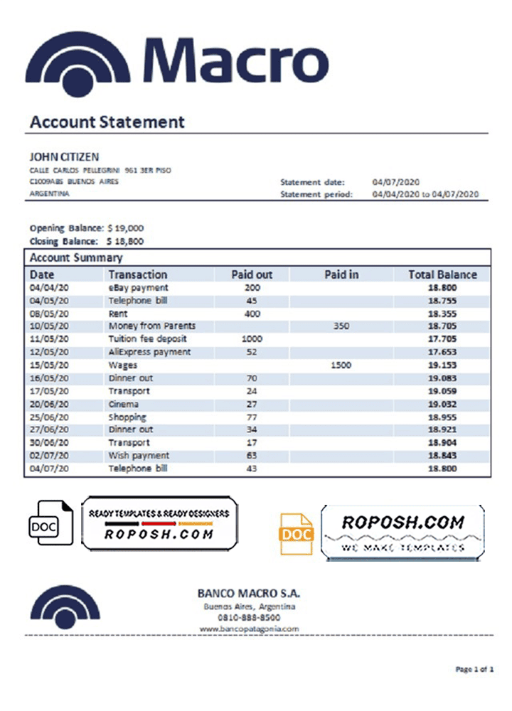 Get your fully editable Argentina Banco Macro S.A. bank statement Word Template from Roposh today. Customize it with your own information to create realistic bank statements, perfect for when your original documents are expired, stolen, or unavailable. We also offer editable credit card templates, ID card templates, bank statement PSD templates, driver’s license PSD templates, and printable editable blank utility bill templates.
