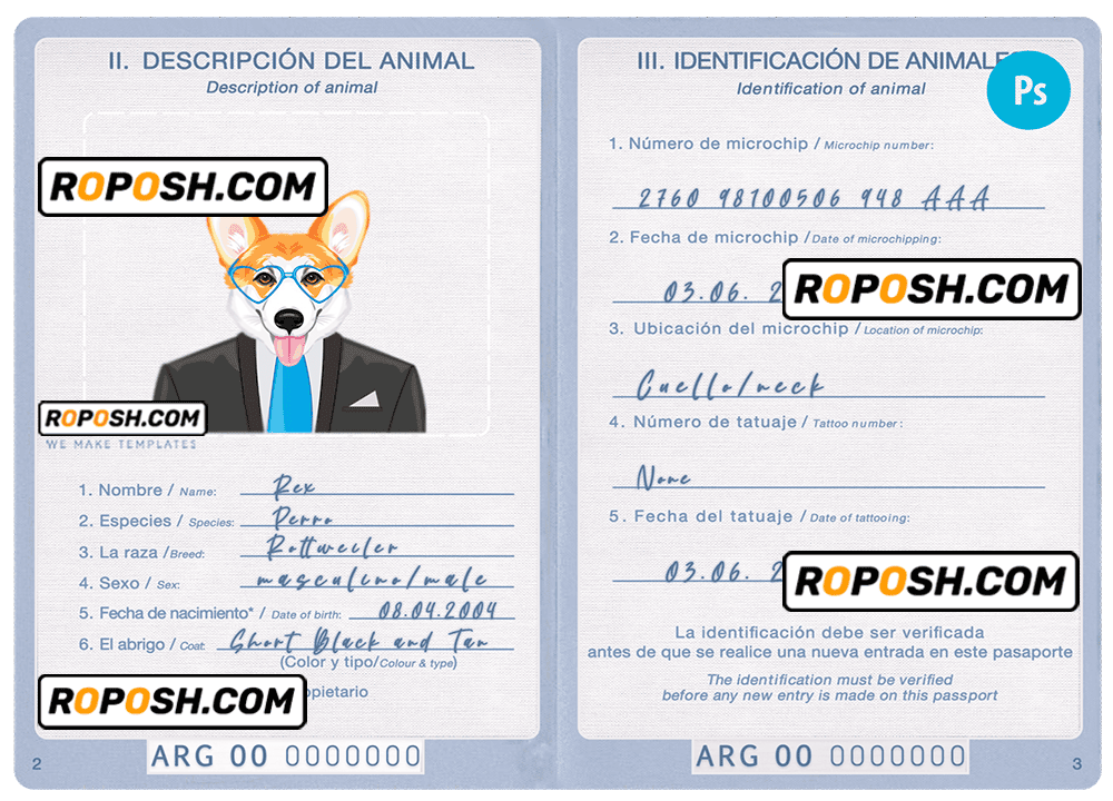 Argentina dog (animal, pet) passport PSD template, is designed to look and feel like real documents. Each template is carefully crafted to include all the necessary details, such as your pet’s name, breed, date of birth, and microchip information. With our fillable cat or dog passport templates, you can quickly and easily create a editable pet passport that meets all the requirements for international travel.