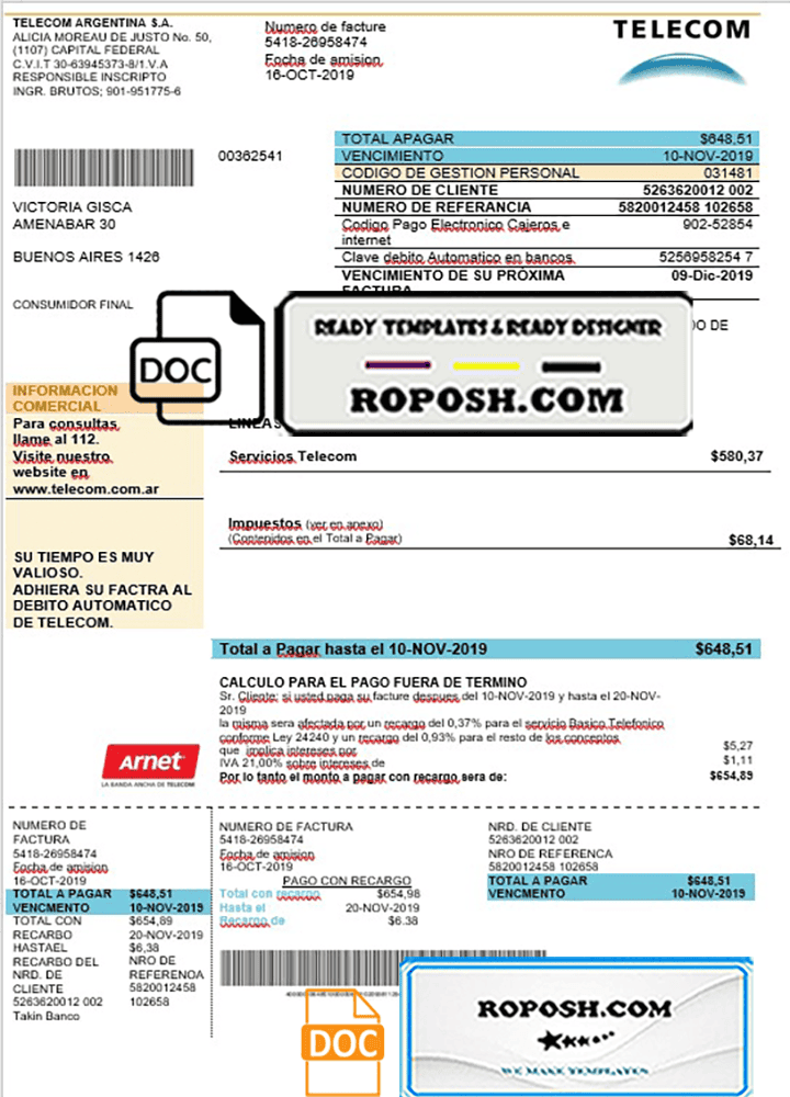 Argentina Telecom Utility Bill Template – Editable Word Document
