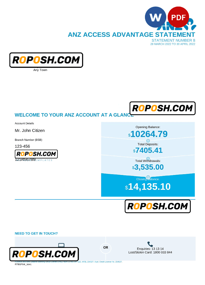 Download our fully editable Australia ANZ Bank Statement Word Template from Roposh and personalize it to create your own novelty documents. This is especially useful if your bank statement is expired, stolen, or unavailable. We also offer editable credit card templates, ID card templates, bank statement PSD templates, driver’s license PSD templates, and printable editable blank utility bill templates.