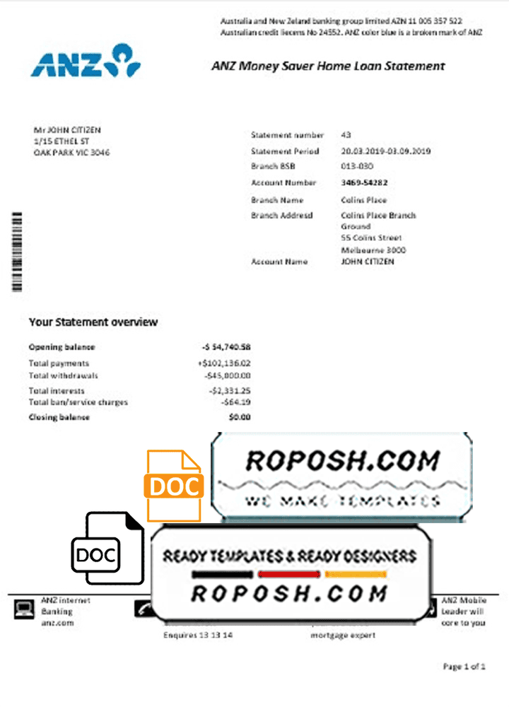 Download the fully editable Australia ANZ Proof of Address Bank Statement Word Template from our website Roposh. Customize it with your own information to create realistic bank statements. This is especially useful if your bank statement is expired, stolen, or unavailable. We also offer editable credit card templates, ID card PSD templates, bank statement PSD templates, driver’s license PSD templates, and printable editable blank utility bill templates.