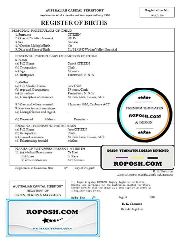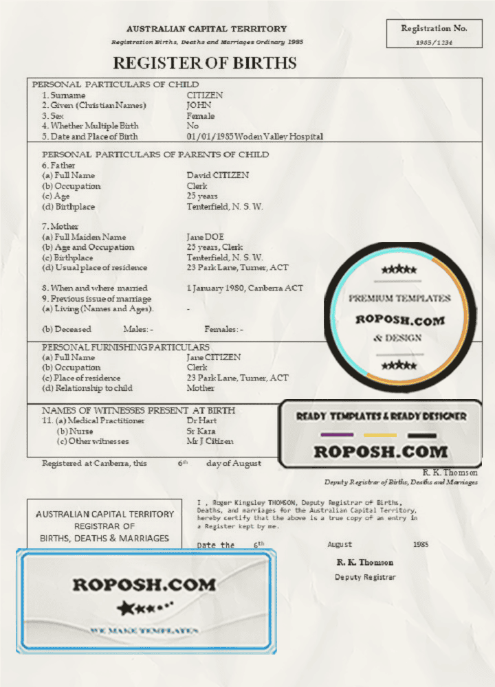 roposh offers hundreds of high-quality, realistic, and customizable birth certificates. The Australia Australian Capital Territory birth certificate template is fully fillable, and you can complete it with any information you wish, such as name, surname, birth date, place of birth and etc. Whether you are using our PSD template (a layer-based adobe photoshop file) or our PDF template (a Microsoft Office editable file) you will get a package with fonts included instantly. No need to worry even if you can’t generate realistic birth proof yourself, we offer reliable editing service with your desired information for an extra charge. Also, we are always online and here to help you experience a confident purchase. So, reach out!