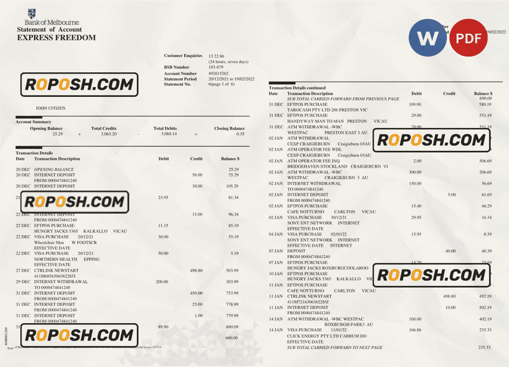 Australia Bank of Melbourne Bank Statement Template – Editable Word and PDF