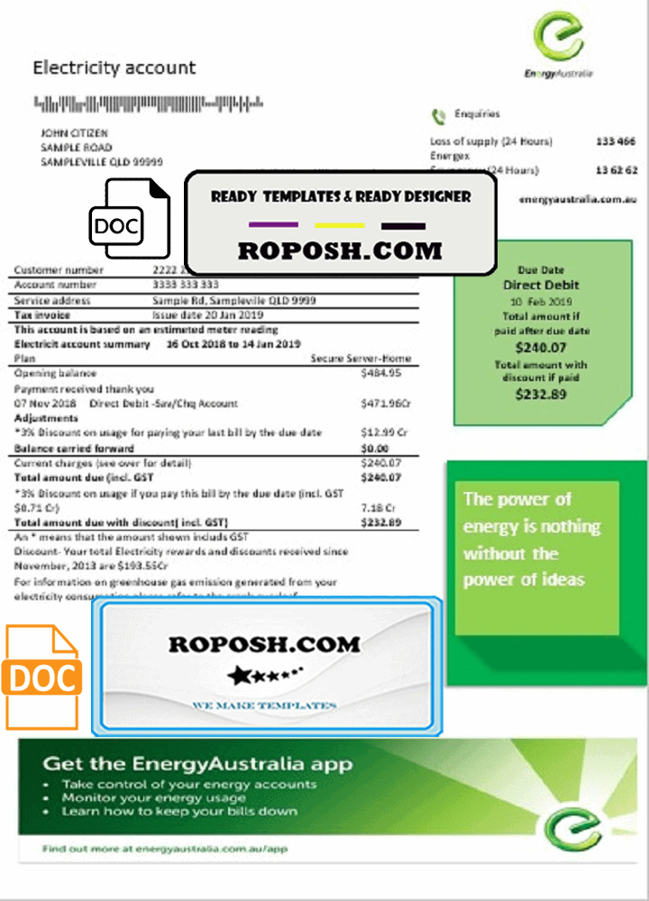Download our fully editable Australia Energy Proof of Address Utility Bill Word Template. This high-quality, customizable template is layer-based and includes all necessary fonts. Easily modify the template to include any name, address, license number, ID number, birth date, height, weight, expiration date, and more. Perfect for creating a editable utility bill for proof of address. Ensure your documents are up-to-date and avoid account suspensions with our premium template.