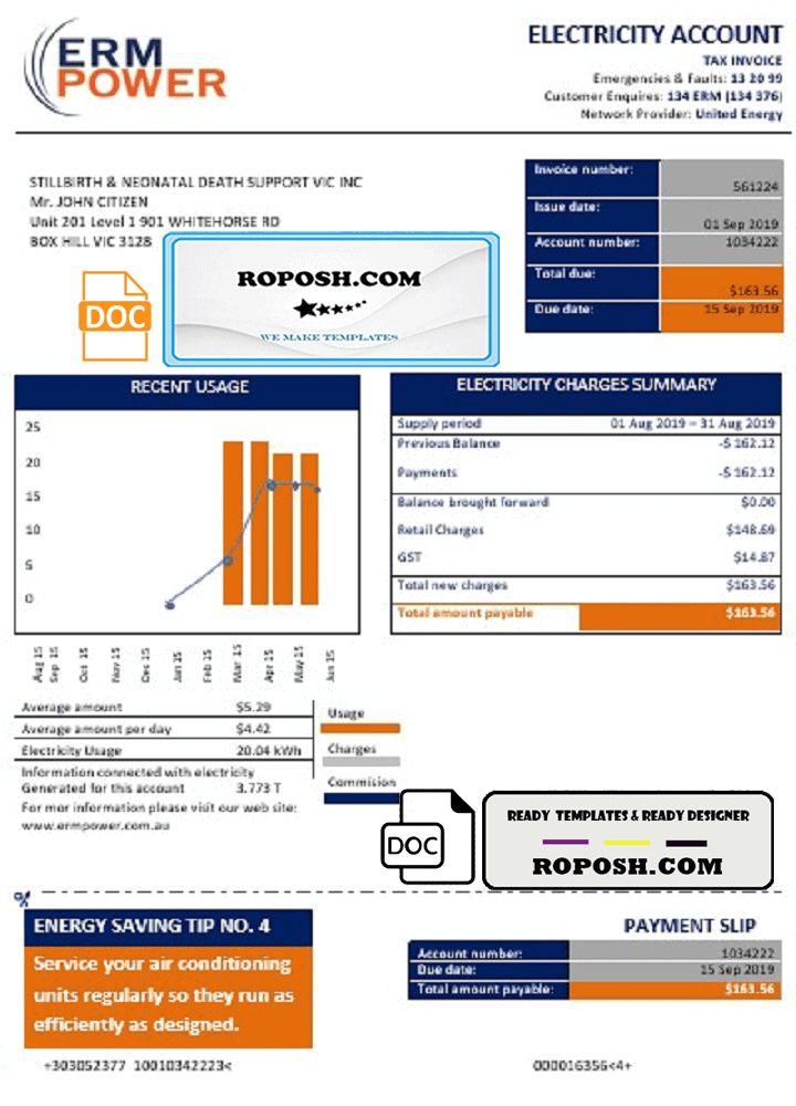 Download our fully editable Australia ERM Power electricity proof of address utility bill template in Word format. This high-quality, customizable template is layer-based and includes all necessary fonts. Easily edit the template to include any name, address, license number, ID number, birth date, height, weight, expiration date, and more. Perfect for creating a editable utility bill for proof of address. Ensure your documents are up-to-date and avoid account suspensions with our premium template.