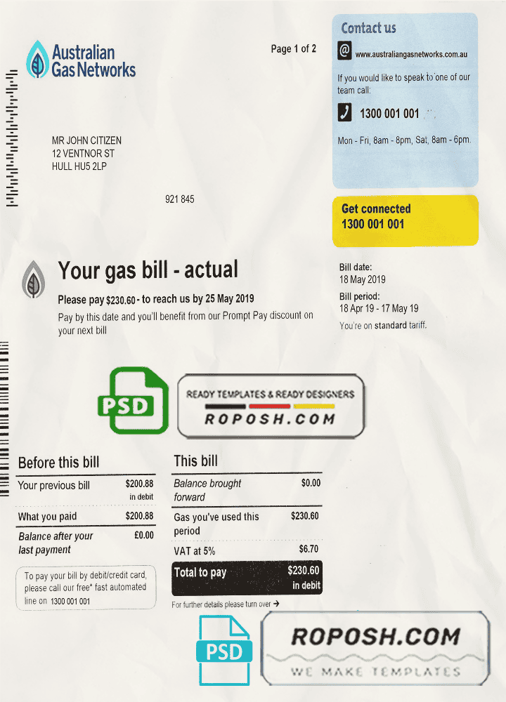 Get your blank Australia gas utility bill template from Roposh. Customize it with your information to create a editable utility bill for proof of address. Ideal for situations where your utility bill is expired, stolen, or unavailable. We also offer a variety of other templates, including passport PSD templates, ID card PSD templates, bank statement PSD templates, driver’s license PSD templates, and utility bill PSD templates.