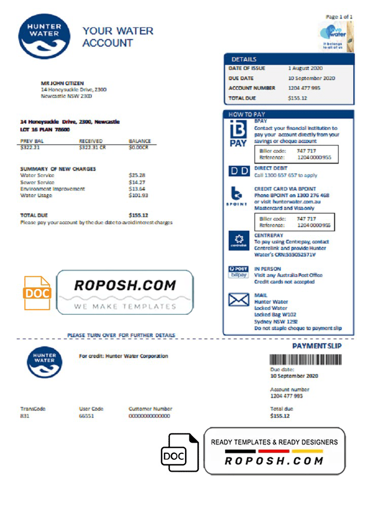Get your blank Australia Hunter Water Utility Bill Template from Roposh today. Customize it with your own information to create a realistic copy for proof of address. Ideal for situations where your utility bill is expired, stolen, or unavailable. Explore our range of templates including passport PSD templates, ID card PSD templates, Bank Statement PSD templates, driver’s license PSD templates, and Utility Bill PSD templates.