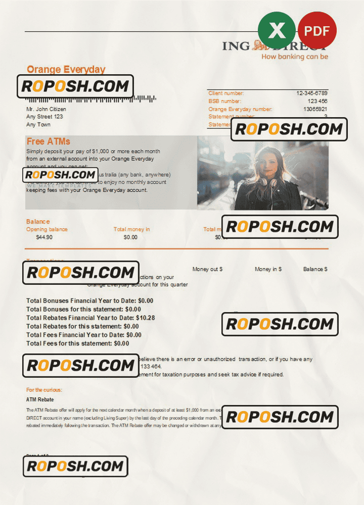 Grab now fully editable Australia ING Direct bank statement Excel Template from our website Roposh and put your own info to create Realistic Bank Statement template Excel and ready your own novelty documents. It’ll be so beneficial if your Bank Statement is expired, stolen or not available.We also have editable credit card, ID Card psd template, Bank Statement psd template, drivers license psd template & printable editable blank utility bill template.