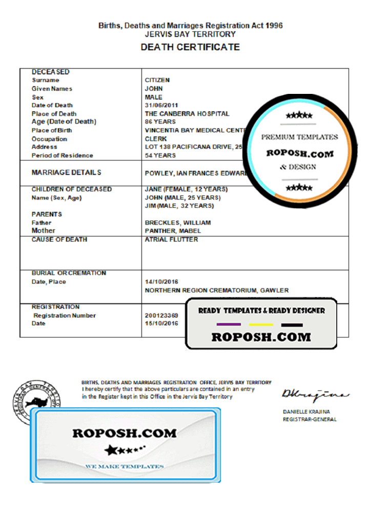Authentic Editable Australia Jervis Bay Territory Death Certificate Template :