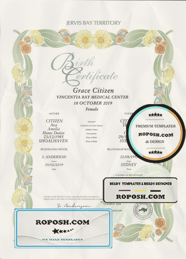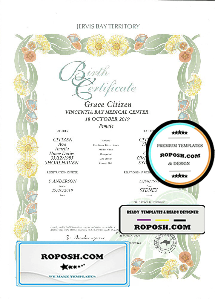 roposh offers hundreds of high-quality, realistic, and customizable birth certificates. The Australia Jervis Bay Territory decorative birth certificate template is fully fillable, and you can complete it with any information you wish, such as name, surname, birth date, place of birth and etc. Whether you are using our PSD template (a layer-based adobe photoshop file) or our PDF template (a Microsoft Office editable file) you will get a package with fonts included instantly. No need to worry even if you can’t generate realistic birth proof yourself, we offer reliable editing service with your desired information for an extra charge. Also, we are always online and here to help you experience a confident purchase. So, reach out!