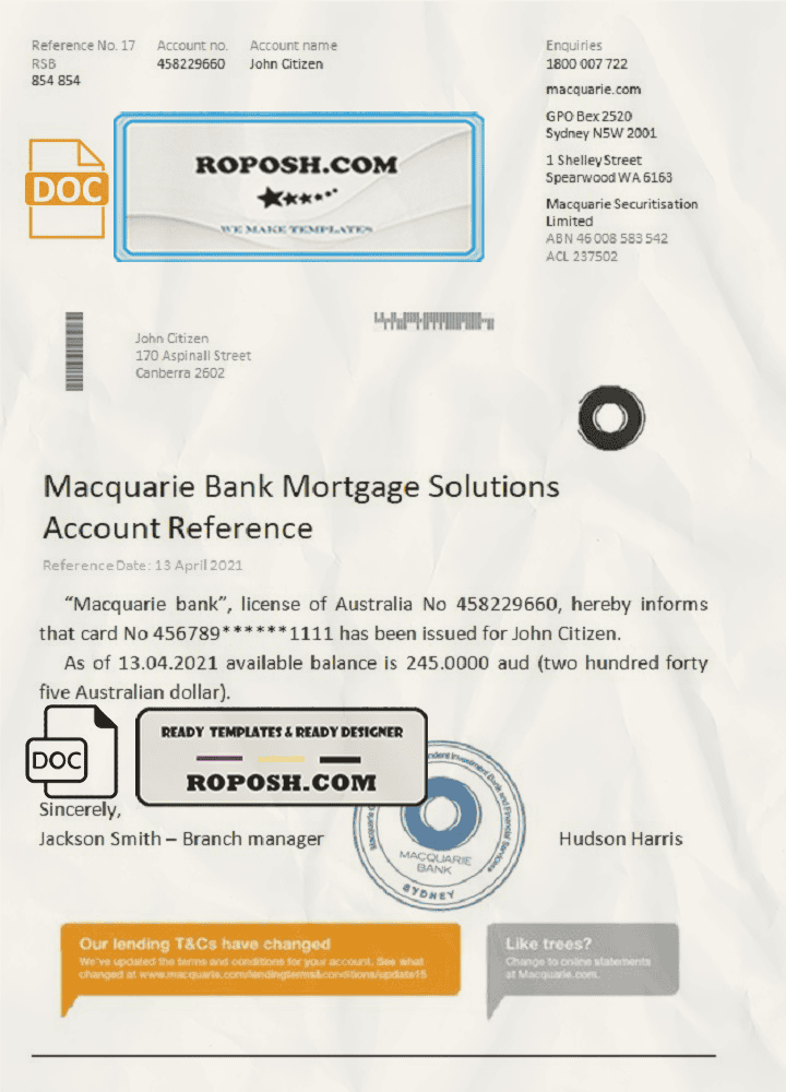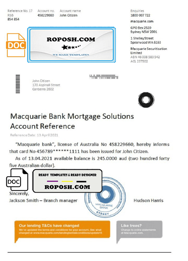 Australia Macquarie bank reference letter template in Word and PDF format