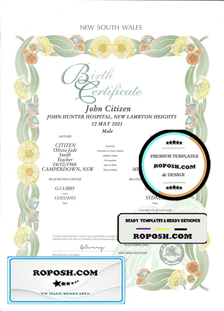 roposh offers hundreds of high-quality, realistic, and customizable birth certificates. The Australia New South Wales decorative (commemorative) birth certificate template is fully fillable, and you can complete it with any information you wish, such as name, surname, birth date, place of birth and etc. Whether you are using our PSD template (a layer-based adobe photoshop file) or our PDF template (a Microsoft Office editable file) you will get a package with fonts included instantly. No need to worry even if you can’t generate realistic birth proof yourself, we offer reliable editing service with your desired information for an extra charge. Also, we are always online and here to help you experience a confident purchase. So, reach out!