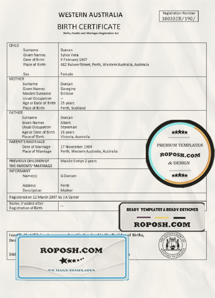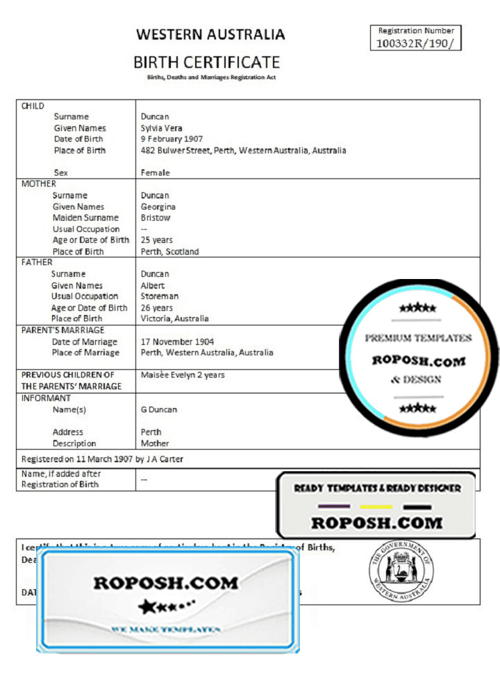 roposh offers hundreds of high-quality, realistic, and customizable birth certificates. The Australia Western Australia birth certificate template is fully fillable, and you can complete it with any information you wish, such as name, surname, birth date, place of birth and etc. Whether you are using our PSD template (a layer-based adobe photoshop file) or our PDF template (a Microsoft Office editable file) you will get a package with fonts included instantly. No need to worry even if you can’t generate realistic birth proof yourself, we offer reliable editing service with your desired information for an extra charge. Also, we are always online and here to help you experience a confident purchase. So, reach out!