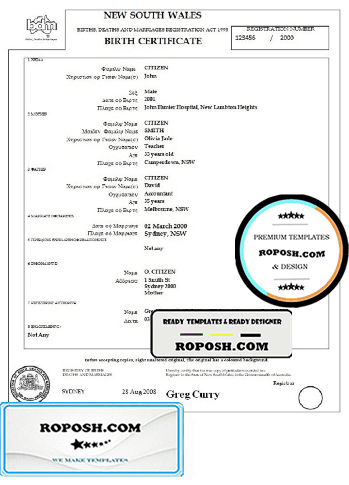 roposh offers hundreds of high-quality, realistic, and customizable birth certificates. The Australia Western Australia birth certificate template is fully fillable, and you can complete it with any information you wish, such as name, surname, birth date, place of birth and etc. Whether you are using our PSD template (a layer-based adobe photoshop file) or our PDF template (a Microsoft Office editable file) you will get a package with fonts included instantly. No need to worry even if you can’t generate realistic birth proof yourself, we offer reliable editing service with your desired information for an extra charge. Also, we are always online and here to help you experience a confident purchase. So, reach out!