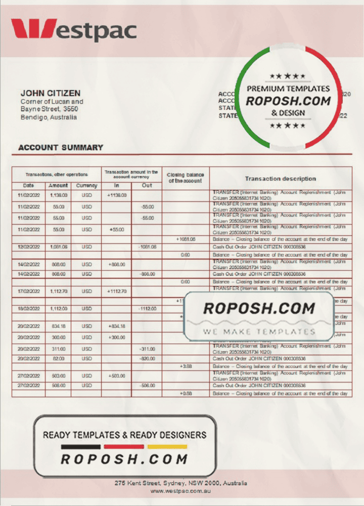 Grab now fully editable Australia Westpac bank statement Word Template from our website Roposh and put your own info to create Realistic Bank Statement Word template and ready your own novelty documents. It’ll be so beneficial if your Bank Statement is expired, stolen or not available.We also have editable credit card, ID Card psd template, Bank Statement psd template, drivers license psd template & printable editable blank utility bill template.