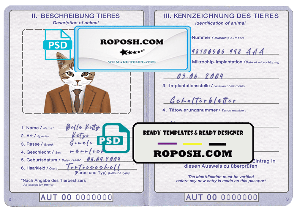Austria cat (animal, pet) passport PSD template, is designed to look and feel like real documents. Each template is carefully crafted to include all the necessary details, such as your pet’s name, breed, date of birth, and microchip information. With our fillable cat or dog passport templates, you can quickly and easily create a editable pet passport that meets all the requirements for international travel.