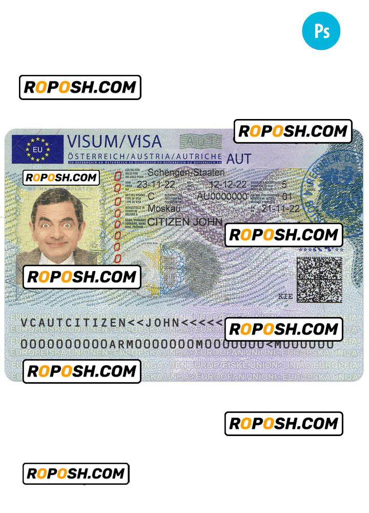 AUSTRIA Schengen visa from Austrian embassy template psd. Buy Customizable Travel Visa Template with high quality and enjoy its unique features such as easy to customize, Layer based, fonts included sample. you can edit this template and put any name, address, license number, Id number, birth date, height, weight, expire date, change photos etc. This Photoshop template is a layer based psd file and it’s easy to Editing.To modify this photoshop template file you will need a Photo editing software such as Adobe Photoshop No need to be expert on editing software like adobe Photoshop. However, You just have to basic knowledge on adobe photoshop, to edit this template. Never used low quality template. Your account may be suspended. Also, if you’re looking for an editable SSN template, Roposh is by your side so you can get it easily and even for free.