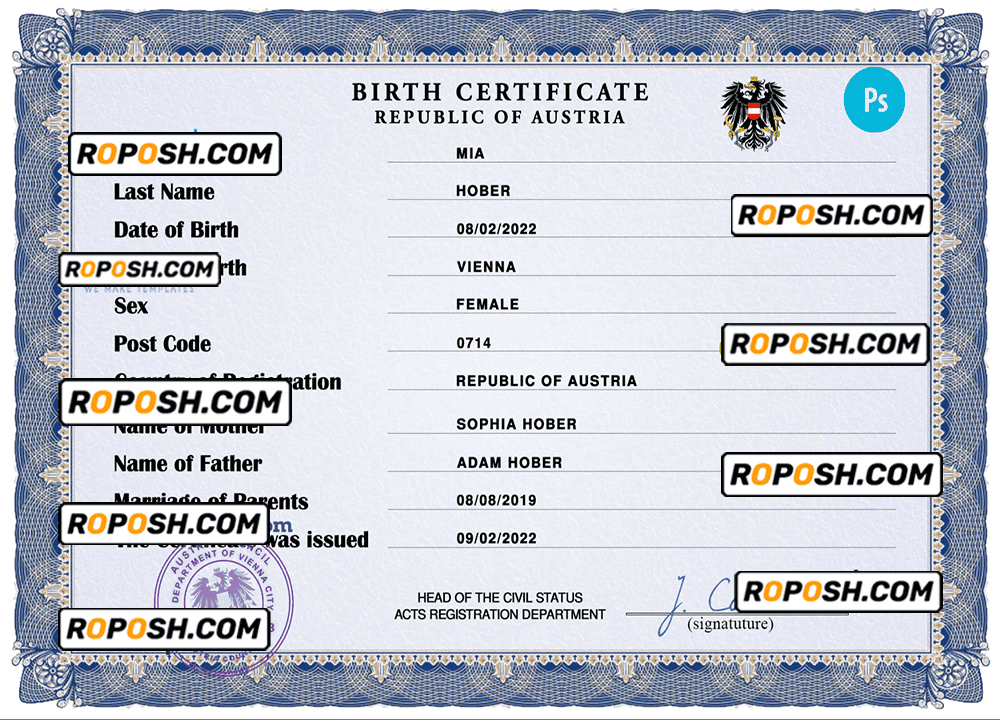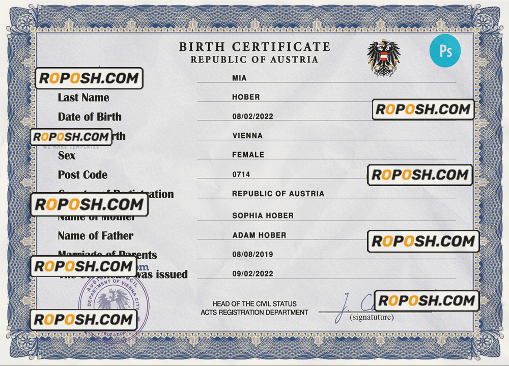 roposh offers hundreds of high-quality, realistic, and customizable birth certificates. The Austria birth certificate template is fully fillable, and you can complete it with any information you wish, such as name, surname, birth date, place of birth and etc. Whether you are using our PSD template (a layer-based adobe photoshop file) or our PDF template (a Microsoft Office editable file) you will get a package with fonts included instantly. No need to worry even if you can’t generate realistic birth proof yourself, we offer reliable editing service with your desired information for an extra charge. Also, we are always online and here to help you experience a confident purchase. So, reach out!