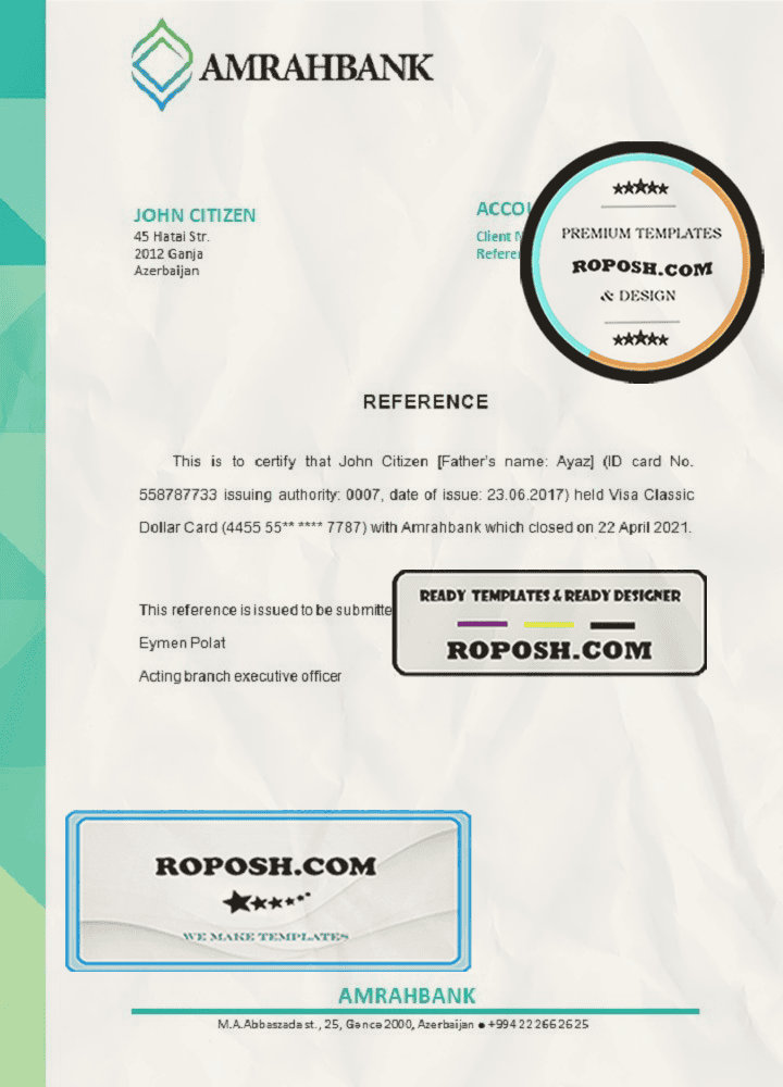 Azerbaijan Amrahbank bank account closure reference letter template in Word and PDF format