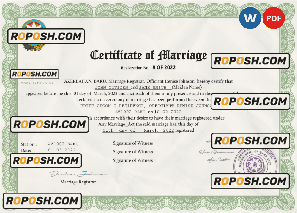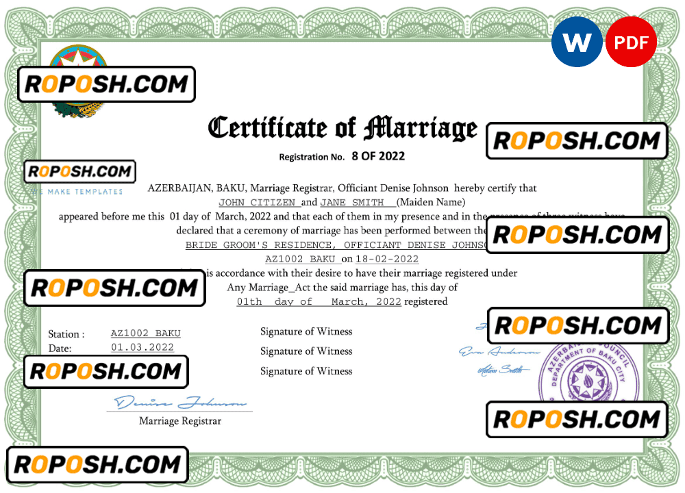 Azerbaijan marriage certificate Word and PDF template, fully editable