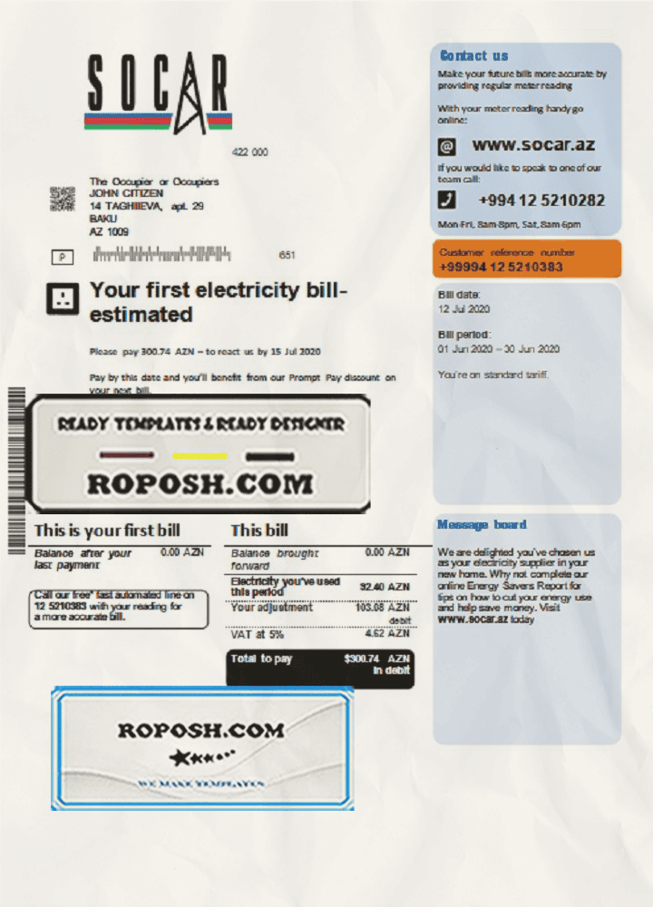 Get your blank Azerbaijan Socar electricity utility bill template from Roposh now. Customize it with your information to create a copy for proof of address. Ideal for situations where your utility bill is expired, stolen, or unavailable. Explore our other templates, including passport PSD templates, ID card PSD templates, bank statement PSD templates, driver’s license PSD templates, and more.