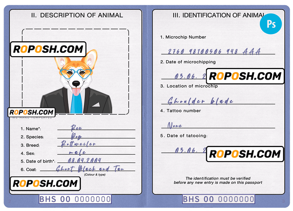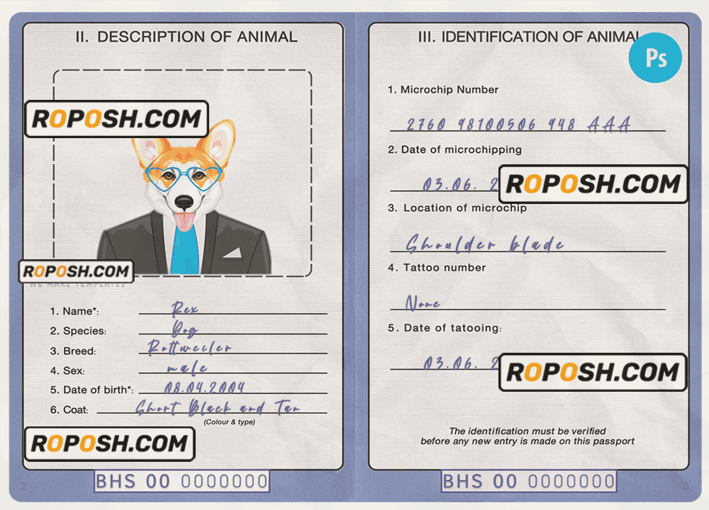 Bahamas dog (animal, pet) passport PSD template, is designed to look and feel like real documents. Each template is carefully crafted to include all the necessary details, such as your pet’s name, breed, date of birth, and microchip information. With our fillable cat or dog passport templates, you can quickly and easily create a editable pet passport that meets all the requirements for international travel.
