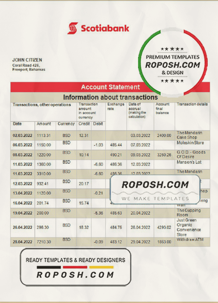 Grab now fully editable Bahamas Scotiabank bank statement Word Template from our website Roposh and put your own info to create Realistic Bank Statement Word template and ready your own novelty documents. It’ll be so beneficial if your Bank Statement is expired, stolen or not available.We also have editable credit card, ID Card psd template, Bank Statement psd template, drivers license psd template & printable editable blank utility bill template.
