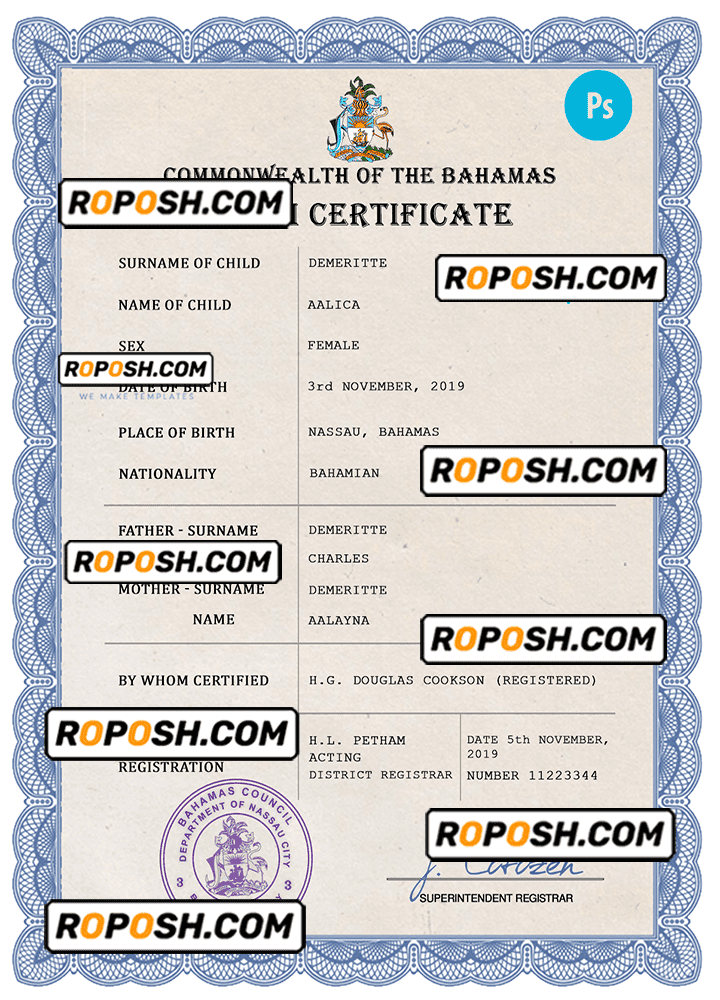 roposh offers hundreds of high-quality, realistic, and customizable birth certificates. The Bahamas birth certificate template is fully fillable, and you can complete it with any information you wish, such as name, surname, birth date, place of birth and etc. Whether you are using our PSD template (a layer-based adobe photoshop file) or our PDF template (a Microsoft Office editable file) you will get a package with fonts included instantly. No need to worry even if you can’t generate realistic birth proof yourself, we offer reliable editing service with your desired information for an extra charge. Also, we are always online and here to help you experience a confident purchase. So, reach out!