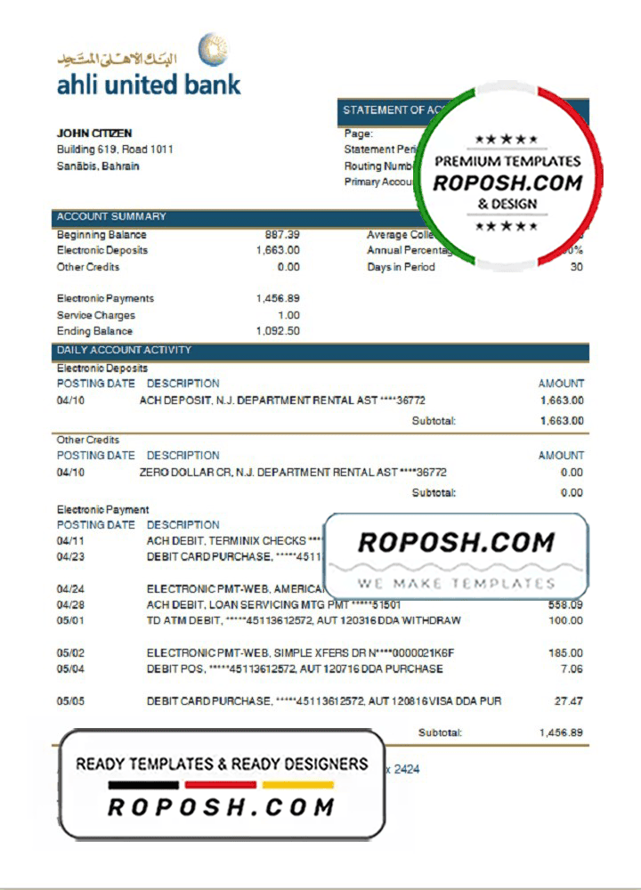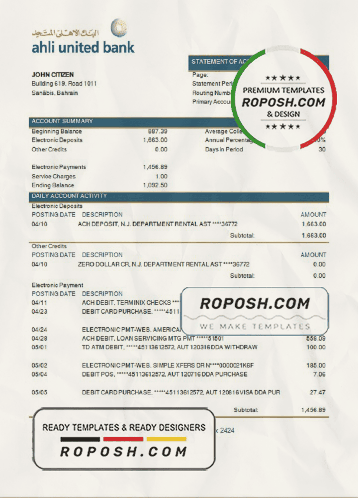 Grab now fully editable Bahrain Ahli United Bank statement Word Template from our website Roposh and put your own info to create Realistic Bank Statement Word template and ready your own novelty documents. It’ll be so beneficial if your Bank Statement is expired, stolen or not available.We also have editable credit card, ID Card psd template, Bank Statement psd template, drivers license psd template & printable editable blank utility bill template.