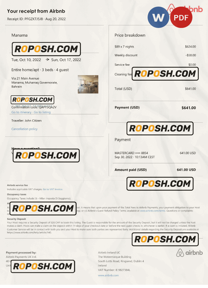 This Blank Bahrain Airbnb booking confirmation PDF Template is perfect for a variety of uses, such as Visa applications, proof of accommodation, showing your expenses, and more. You can even use it to create realistic copies of your credit card for novelty documents. We have a variety of other templates available, including passport templates, ID card templates, reciept template, and more.
