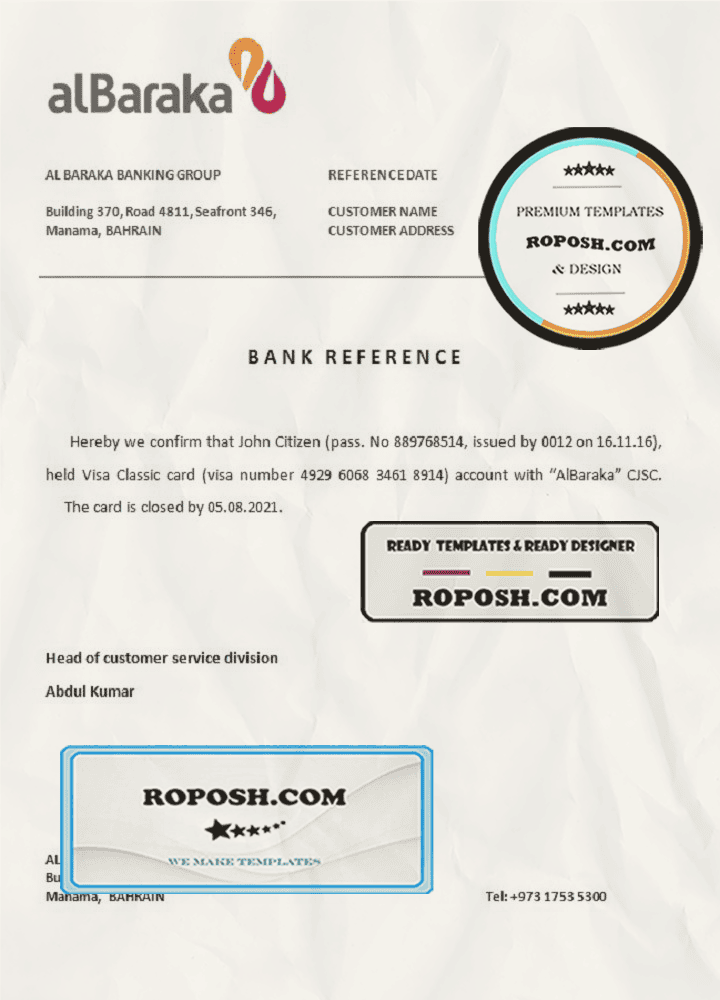 Bahrain Al Baraka bank account closure reference letter template in Word and PDF format