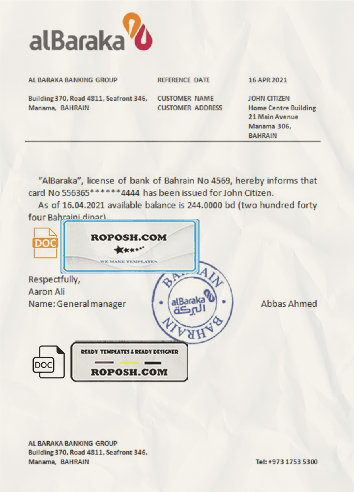 Bahrain Al Baraka bank account reference letter template in Word and PDF format