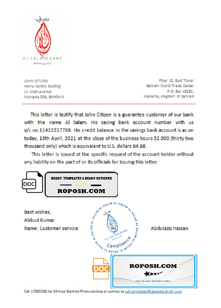 Bahrain Al Salam bank reference letter template in Word and PDF format