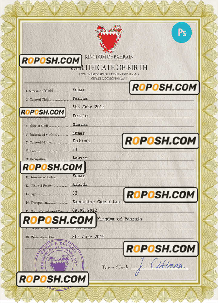 roposh offers hundreds of high-quality, realistic, and customizable birth certificates. The Bahrain birth certificate template is fully fillable, and you can complete it with any information you wish, such as name, surname, birth date, place of birth and etc. Whether you are using our PSD template (a layer-based adobe photoshop file) or our PDF template (a Microsoft Office editable file) you will get a package with fonts included instantly. No need to worry even if you can’t generate realistic birth proof yourself, we offer reliable editing service with your desired information for an extra charge. Also, we are always online and here to help you experience a confident purchase. So, reach out!
