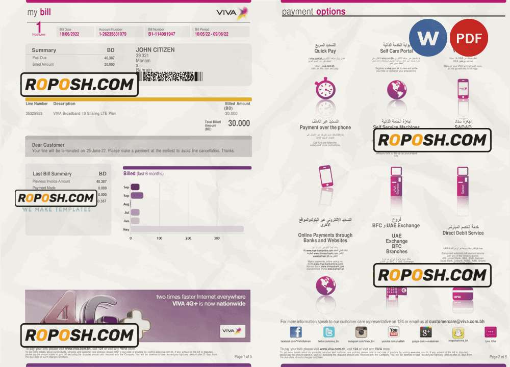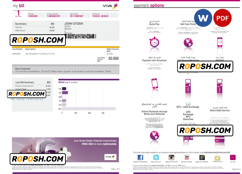 Get your blank Bahrain Viva Utility Bill Template from Roposh today. Customize it with your information to create a convincing proof of address document. This template is especially useful if your original utility bill is expired, lost, or unavailable. We also offer a wide range of templates including passport PSD templates, ID card PSD templates, bank statement PSD templates, driver’s license PSD templates, and utility bill PSD templates.