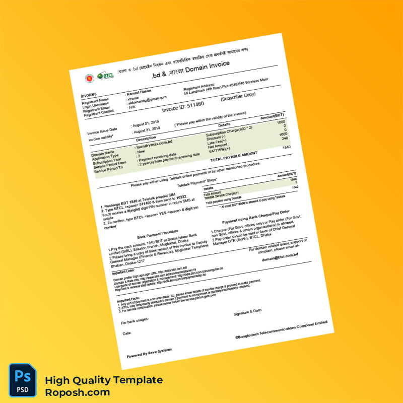 Editable Invoice Template for Bangladesh Telecommunications – Word & PDF Formats