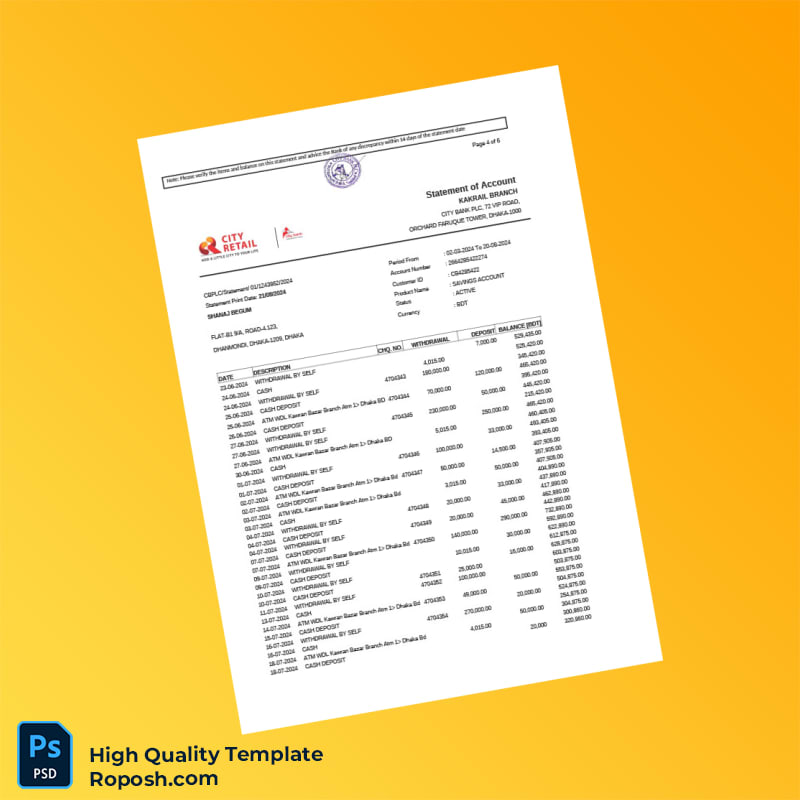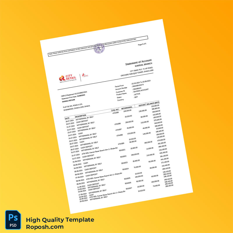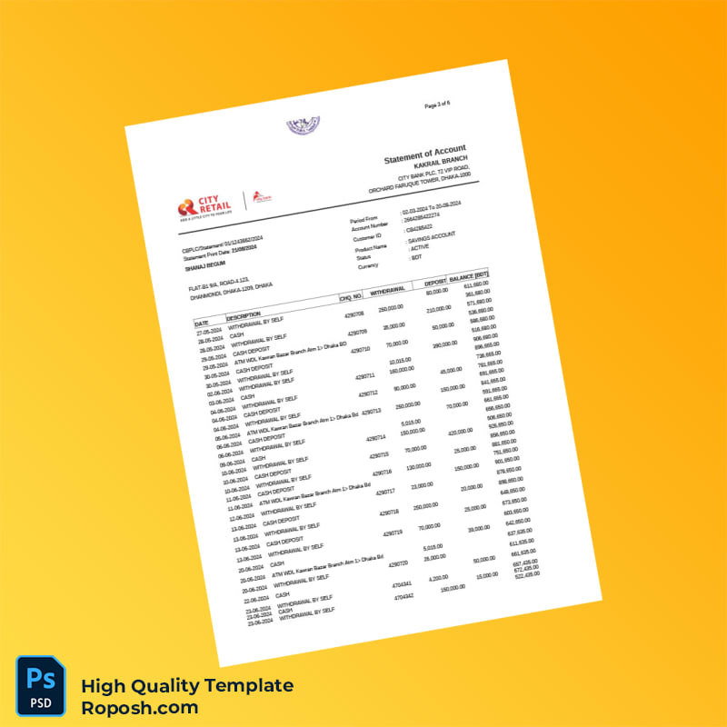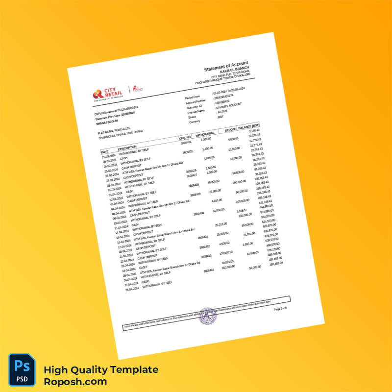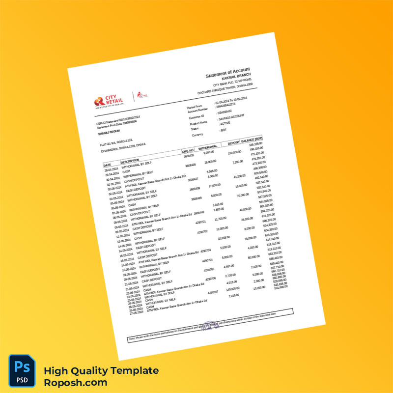 Looking to produce a professional bank statement quickly and effortlessly? Our Bangladesh City Bank Statement Template, available in both Word and PDF formats, is designed to meet your needs seamlessly.