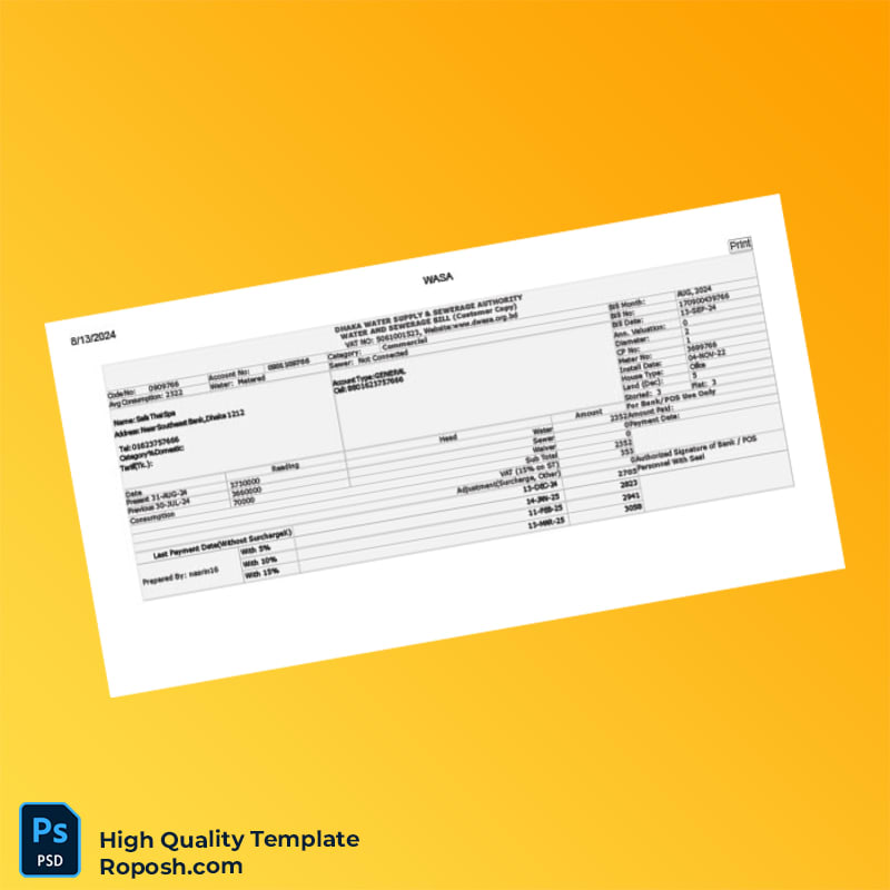 If you’re seeking a reliable solution for proof of address needs, you’ve come to the right place. The Bangladesh Dhaka Water Supply Sewerage Authority Editable Utility Bill Template is designed specifically for those in urgent need of a customizable utility bill template. Whether you’ve lost important documents or need a quick replacement, our template provides a seamless way to meet your requirements.