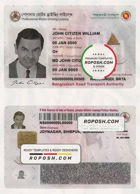 Get your fully editable Bangladesh driver’s license PSD template from our website, Roposh. Customize it with your own information to create a realistic driver’s license. This template is ideal for creating novelty documents if your ID card is expired, stolen, or unavailable. We also offer passport PSD templates, blank ID card templates, bank statement PSD templates, driver’s license PSD templates, and travel visa psd template.