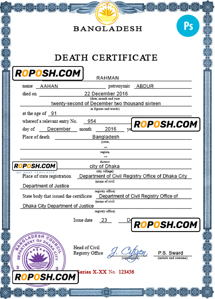 Explore a vast collection of legitimate-looking editable death certificates for several countries worldwide. The editable Bangladesh death certificates offers easy access to obtaining the required document for a variety of purposes, predominantly claiming life insurance, pensions, and resolving estates.